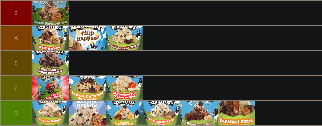 - half baked 7/10, cookiedough 2/10(Eis ist lame + viele zu süß), Vermont Cookie 9/10, Chip happens 7/10, hazelnuttin But chocolate 2/10, Karamell Sutra core 5/10, oh my banoffee pie 3/10, netflixnchill 1/10 ihn Erdnusseis, nondairyBerryrevolutionary 4/10, fish? /10, baked Alaska /10, choc fudge brownie,